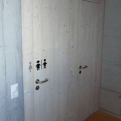 Für den Kindergarten in Zollikofen haben wir nicht nur eine Trennwand aus Fichte mit Schallschutzglas eingebaut, sondern auch Trennwandmöbel mit viel Stauraum, die den Raum effizient unterteilen. Diese Möbel schaffen klare Strukturen und lassen gleichzeitig Licht und Sicht durch. Zusätzlich wurden die Türen, zum Beispiel bei den Toiletten, komplett erneuert, um das Design zu vervollständigen. Die Kindergarderobe ist robust, praktisch und bietet ausreichend Platz für Jacken und Taschen – schlicht, langlebig und funktional.